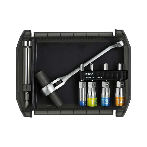 - Thiết kế đa năng: Bộ cờ lê bao gồm nhiều kích cỡ đầu tuýp (10mm, 13mm, 14mm, 17mm, 12mm) đáp ứng nhiều nhu cầu siết chặt khác nhau.