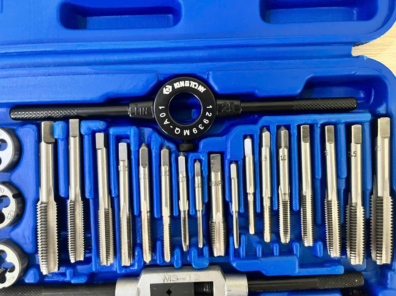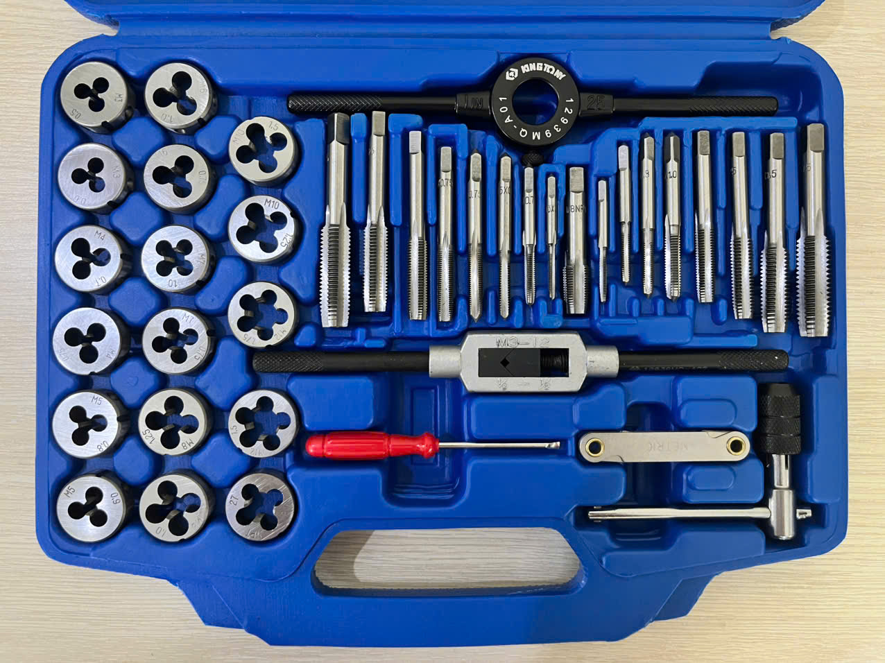 | Kích cỡ ren | M3 x 0.5, M3 x 0.6, M4 x 0.7, M4 x 0.75, M5 x 0.8, M5 x 0.9, M6 x 1.0, M6 x 0.75, M7 x 1.0, M7 x 0.75, M8 x 1.25, M8 x 1.0, M10 x 1.5, M10 x 1.25, M12 x 1.75, M12 x 1.5, 1/8NTP – 1 tay quay M3 ~ M12 (1/16” ~1/2”) – 1 tay quay M25 (1”) – 1 vít dẹp 90mm. – 1 dưỡng đo ren. – 1 tay quay chữ T |